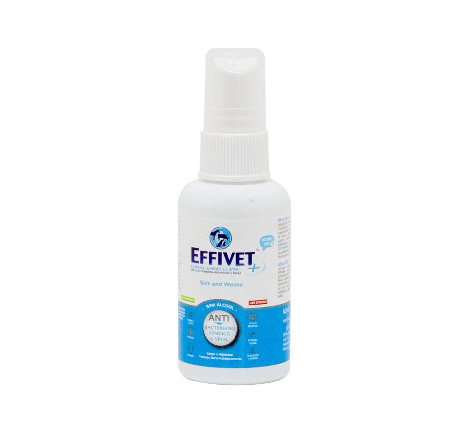 Effivet para a pele e feridas, adequado para várias espécies de animais, é um spray com ácido hipocloroso que aumenta o fluxo sanguíneo para a zona da ferida e elimina 99.9%das bactérias, vírus e fungos, reduzindo a inflamação e eliminando o odor