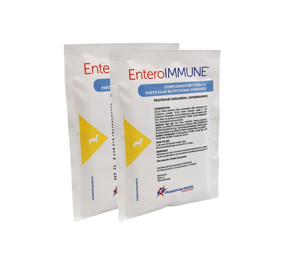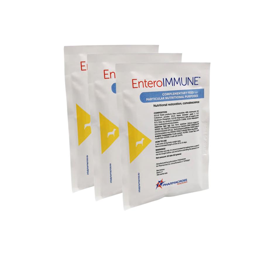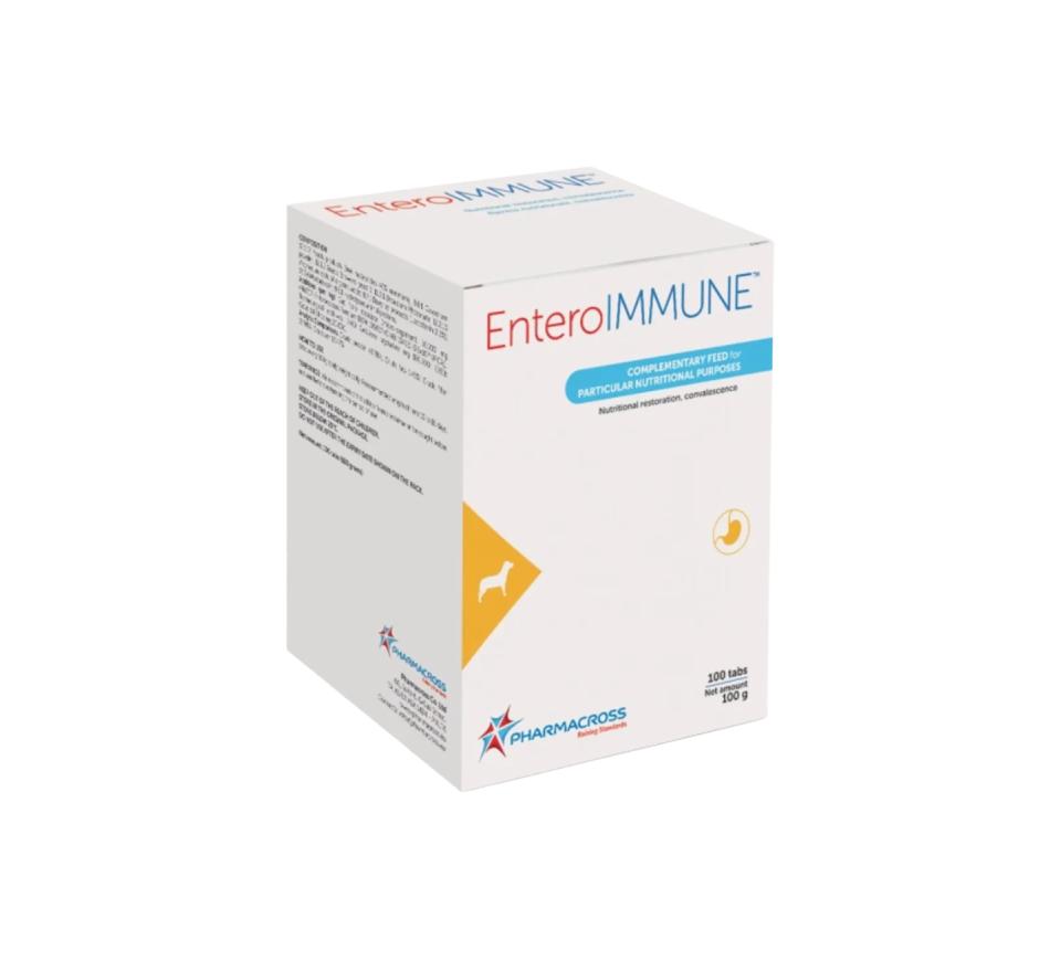 EnteroIMMUNE™, em virtude de seu conteúdo em Enterococcus faecium DSM 10663/NCIMB 10415 (E1707), Immunity Complex ™ (Nucleotídeos e Lactoferrina) e Colostro, é um alimento complementar destinado a auxiliar na recuperação nutricional e na convalescença em cães e gatos.