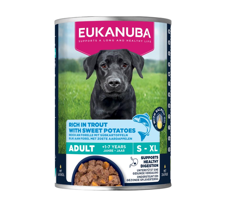Mime o seu amigo patudo com a irresistível ração Eukanuba Cão Adulto Ração Húmida - Truta com Batata Doce!
