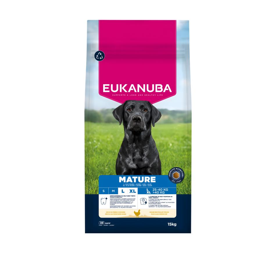Mime o seu amigo patudo com a irresistível ração seca Eukanuba Cão Maduro Raça Grande - Frango Fresco!