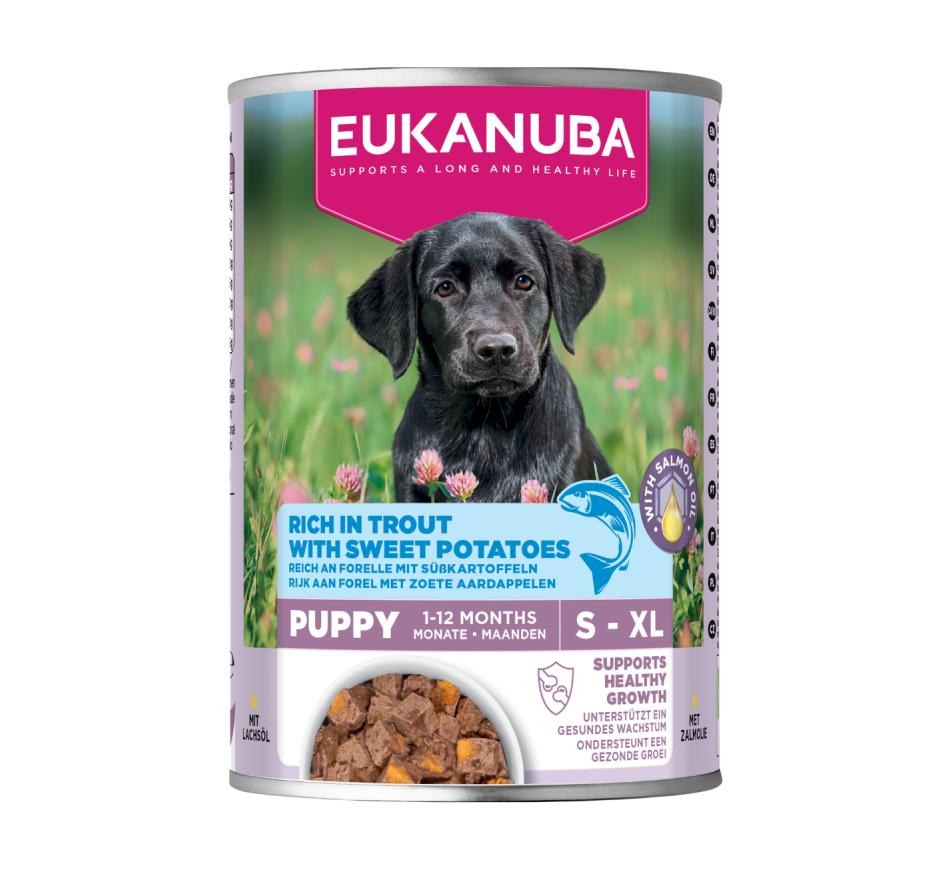 Mime o seu amigo patudo com a irresistível ração Eukanuba Cão Puppy Ração Húmida - Truta com Batata Doce!