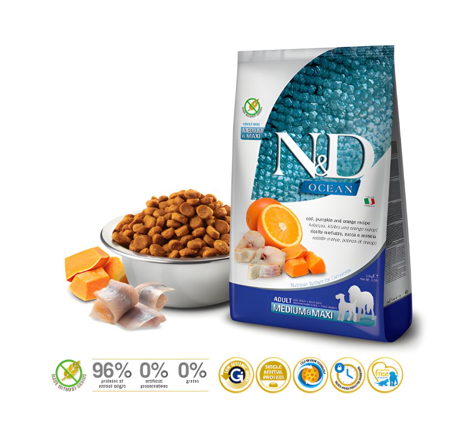 Descubra a nutrição de excelência para o seu cãozinho com o Farmina N&D Ocean Cão Adult Medium & Maxi - Bacalhau e Abóbora!
