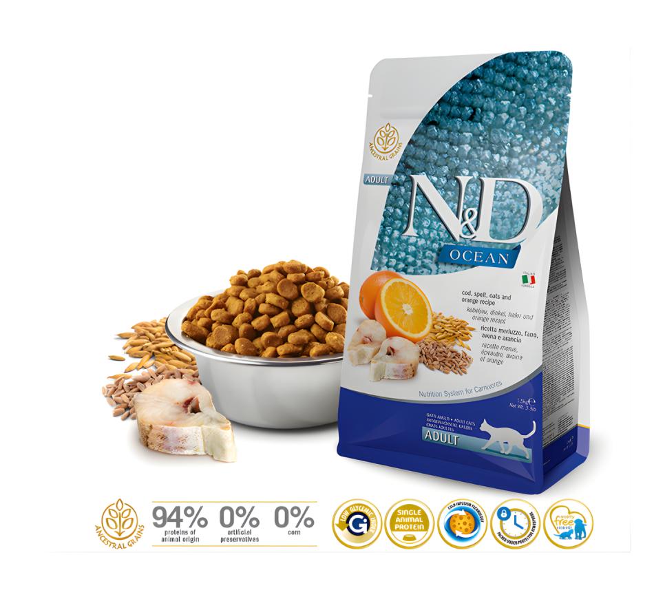 Ofereça ao seu gato a nutrição premium que ele merece com o Farmina N&D Ocean Low Grain Gato Adulto - Bacalhau. Este alimento seco completo é especialmente formulado com bacalhau fresco e laranja, oferecendo uma dieta equilibrada e nutritiva para gatos adultos.