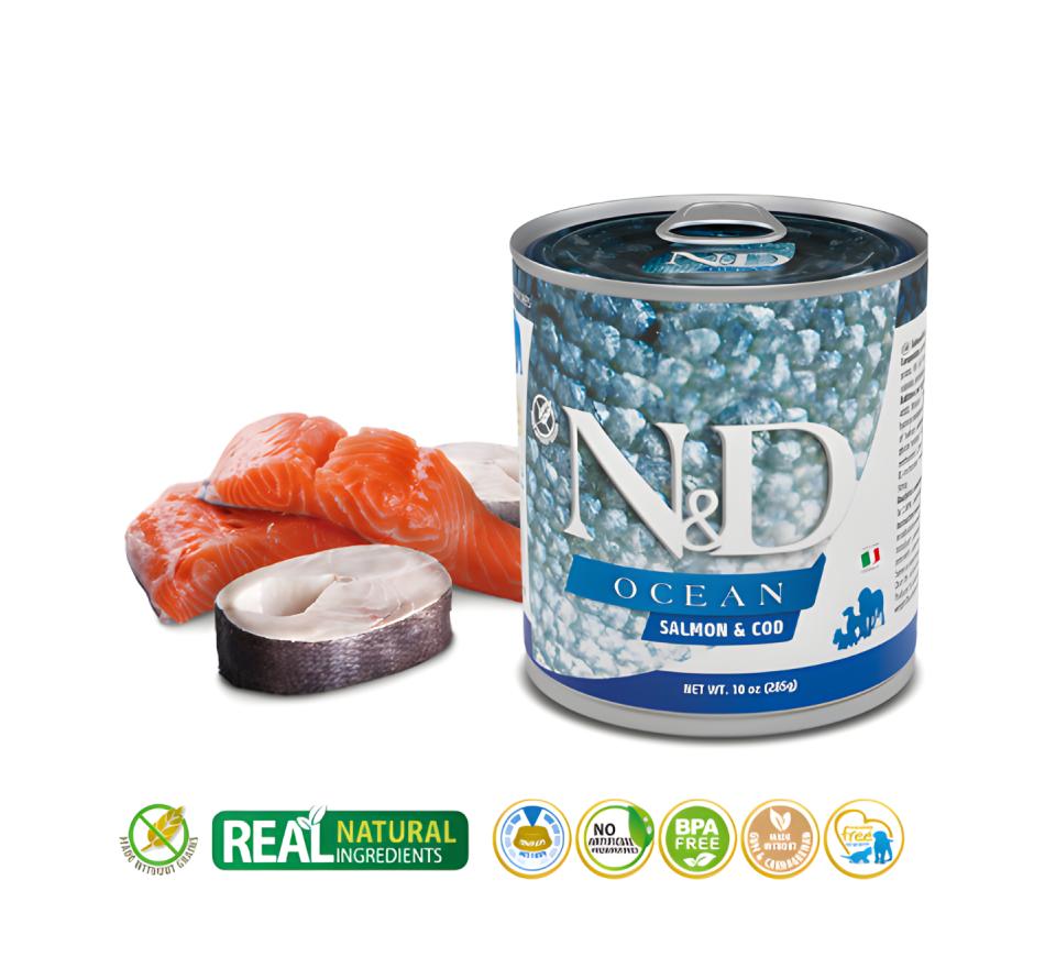 A ração húmida Farmina N&D Ocean Wet Cão Adulto - Salmão e Bacalhau é um alimento completo para cães adultos, com frutos do mar de alta qualidade.
