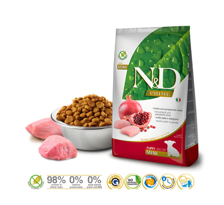 Apresentamos o Farmina N&D Prime Cão Puppy Mini - Frango, um alimento seco completo especialmente formulado para atender às necessidades nutricionais de cachorros e cadelas gestantes ou lactantes de raças pequenas ou mini.