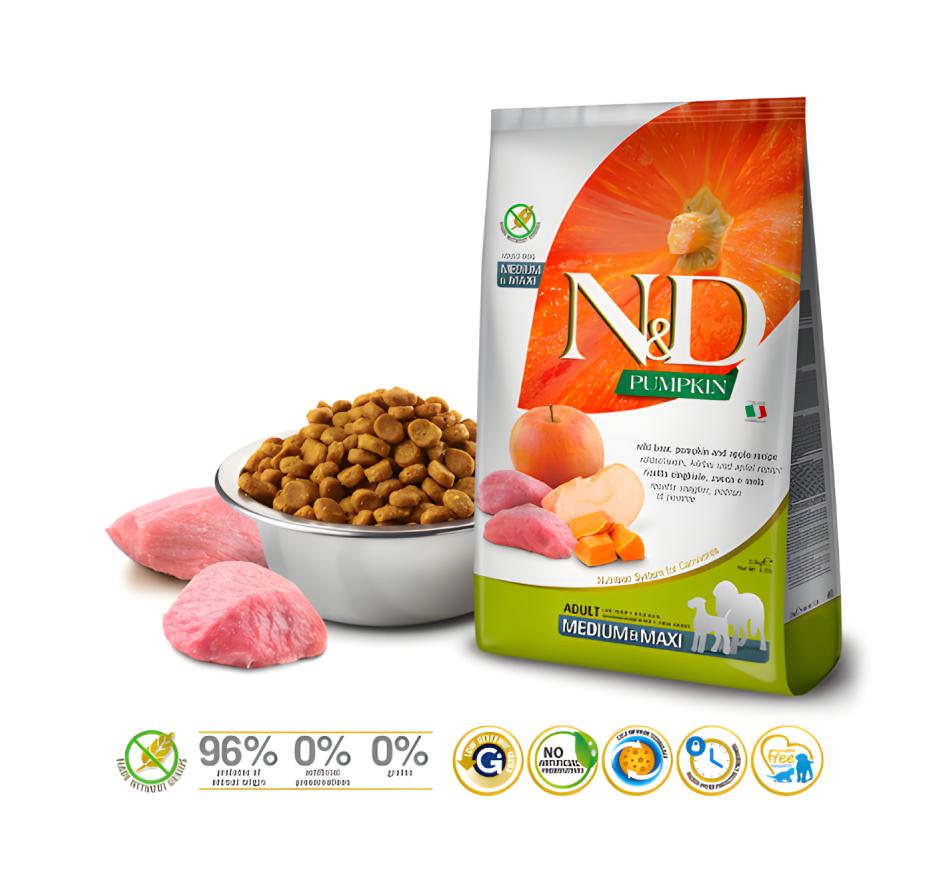 Alimento seco completo para cães adultos de de raça médio e grande, formulado com javali, abóbora e maça.