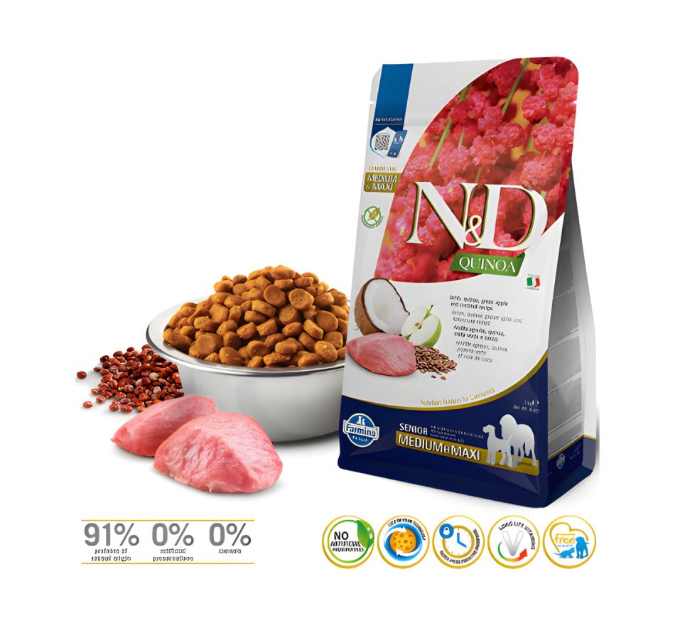 Ofereça ao seu cão sênior o melhor em nutrição com o Farmina N&D Quinoa Cão Senior Mini - Cordeiro, um alimento seco completo especialmente formulado para cães de raças médias ou grandes a partir dos 7 anos.