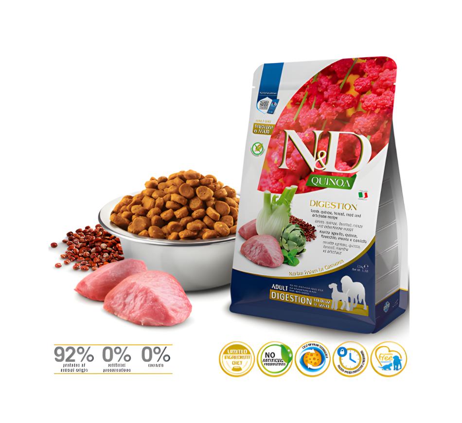 Apresentamos o Farmina N&D Quinoa Digestion Cão Adult Mini - Cordeiro, um alimento seco completo, especialmente formulado para cães adultos de raça média ou grande que enfrentam desafios de digestão.