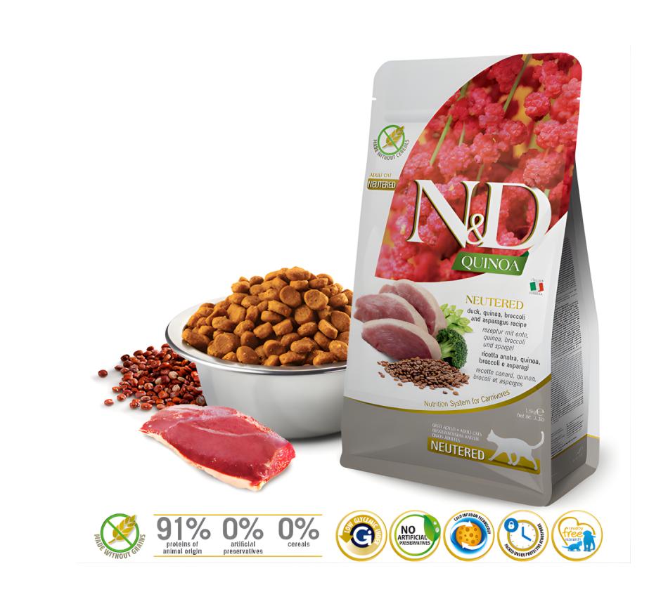 Descubra a alimentação perfeita para o seu gato adulto esterilizado com o Farmina N&D Quinoa Neutered Gato Esterilizado - Pato.