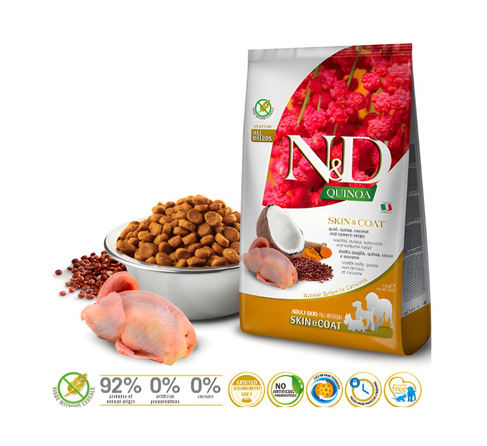 Descubra a nutrição personalizada que o seu melhor amigo merece com o Farmina N&D Quinoa Skin Coat Cão Adult All Breeds - Codorniz.