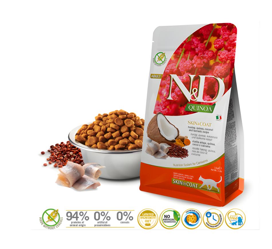 Dê ao seu gato a nutrição que ele merece com o Farmina N&D Quinoa Skin Coat Gato Adulto - Arenque.