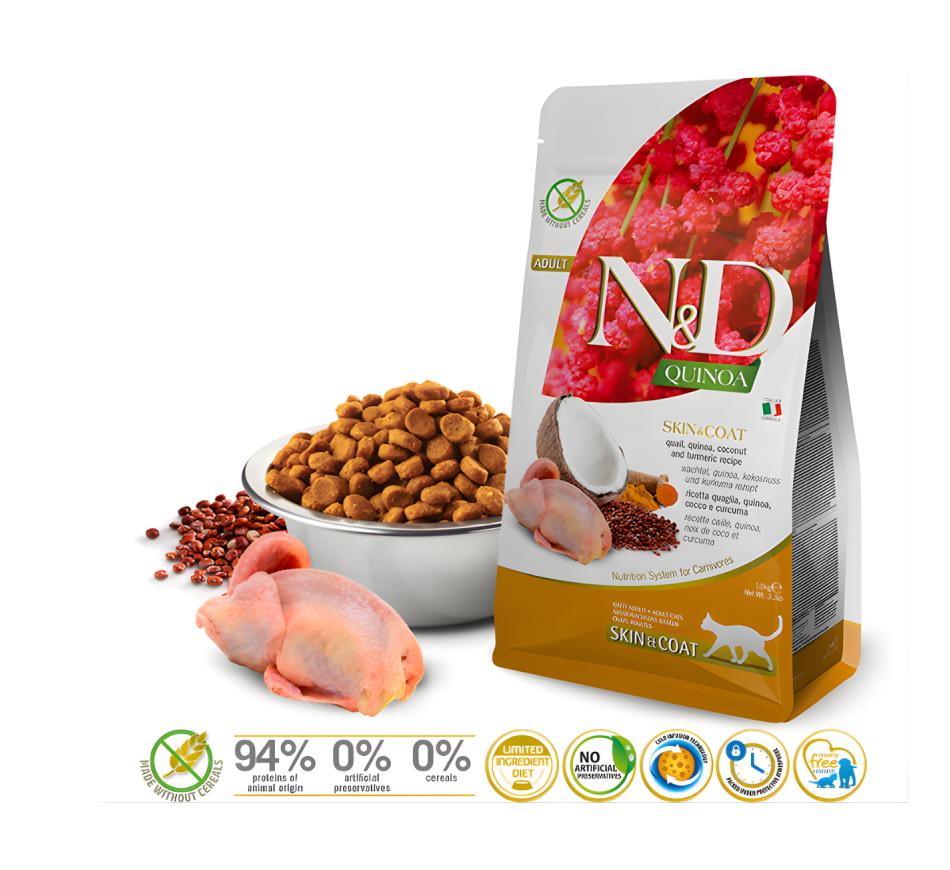 Proporcione ao seu gato a nutrição que ele merece com o Farmina N&D Quinoa Skin Coat Gato Adulto - Codorniz, um alimento seco completo e equilibrado, especialmente formulado para atender às necessidades dos felinos adultos.