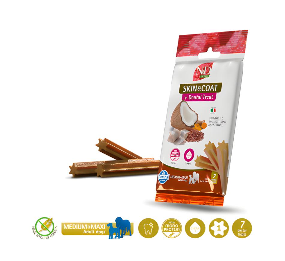 Os deliciosos biscoitos Farmina N&D Quinoa Skin Coat Treat Cão Medium & Maxi - Arenque são um alimento complementar indicado para cães com mais de 4 meses de idade de porte médio a grande.