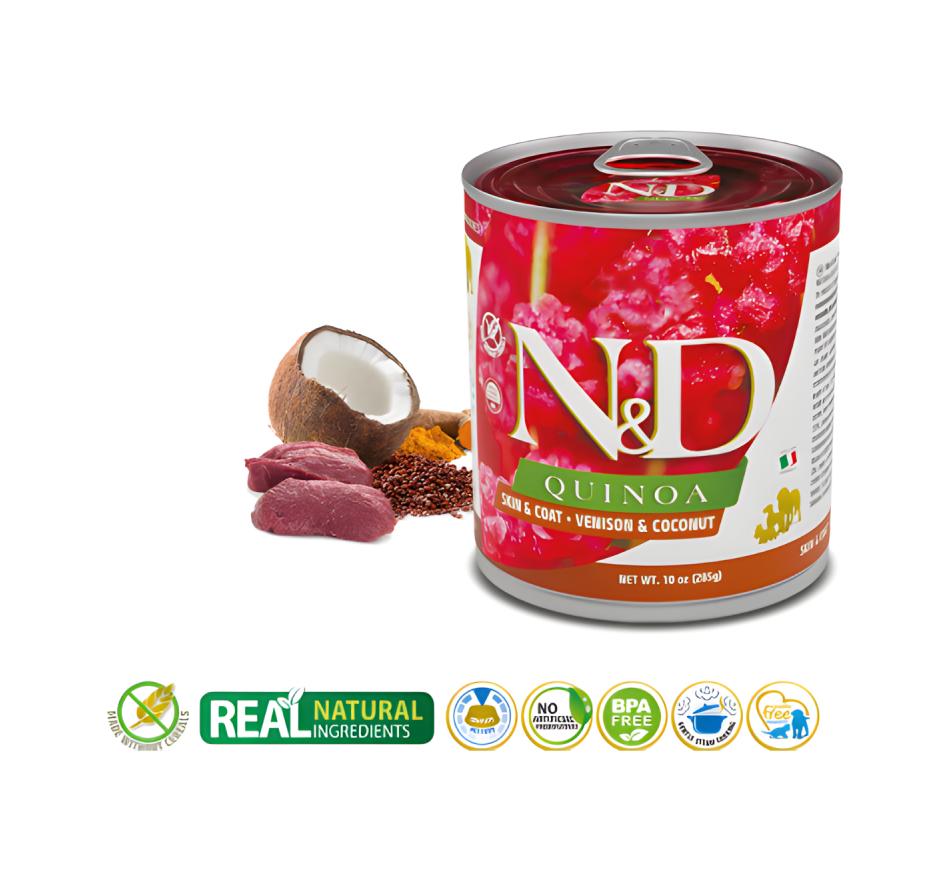A ração húmida Farmina N&D Quinoa Skin Coat Wet Cão - Veado é um alimento dietético completo para cães adultos, recomendado para aqueles com intolerâncias leves a ingredientes e nutrientes.
