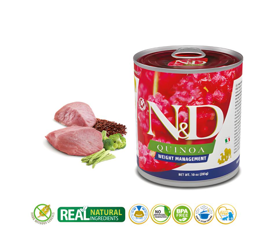 A ração húmida Farmina N&D Quinoa Weight Management Wet Cão - Cordeiro é um alimento dietético completo para cães adultos, indicado para a redução do excesso de peso corporal.
