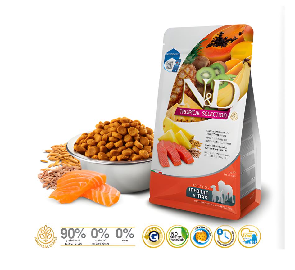 Transforme a alimentação do seu pequeno amigo com o Farmina N&D Tropical Selection Cão Adult Medium & Maxi - Salmão, um alimento seco completo e nutritivo, especialmente formulado para cães adultos de raças médias e grandes.