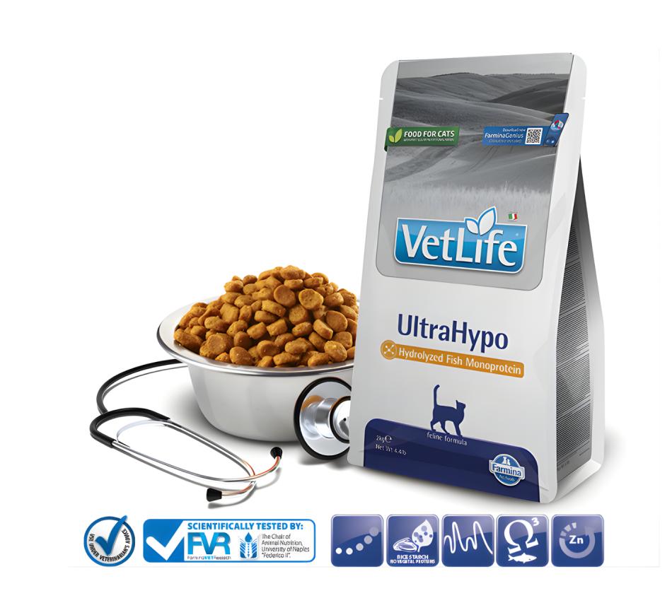 O Farmina Vet Life Ultrahypo Gato - Peixe é recomendado para gatos que sofrem de doenças inflamatórias intestinais (DII) e episódios de vômito recorrente.