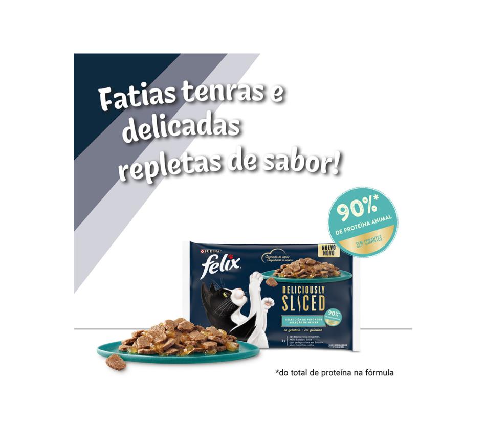 Felix Deliciously Sliced é uma gama de irresistíveis refeições, muito saborosas e tentadoras. Cada receita, feita com ingredientes de qualidade, tem tenros pedaços em gelatina, para uma saborosa refeição que o seu gato vai adorar.