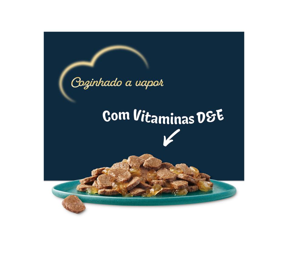 Uma receita 100% completa e equilibrada de deliciosas refeições. 90% de Proteína Animal, do total da proteína na fórmula. Sem corantes.