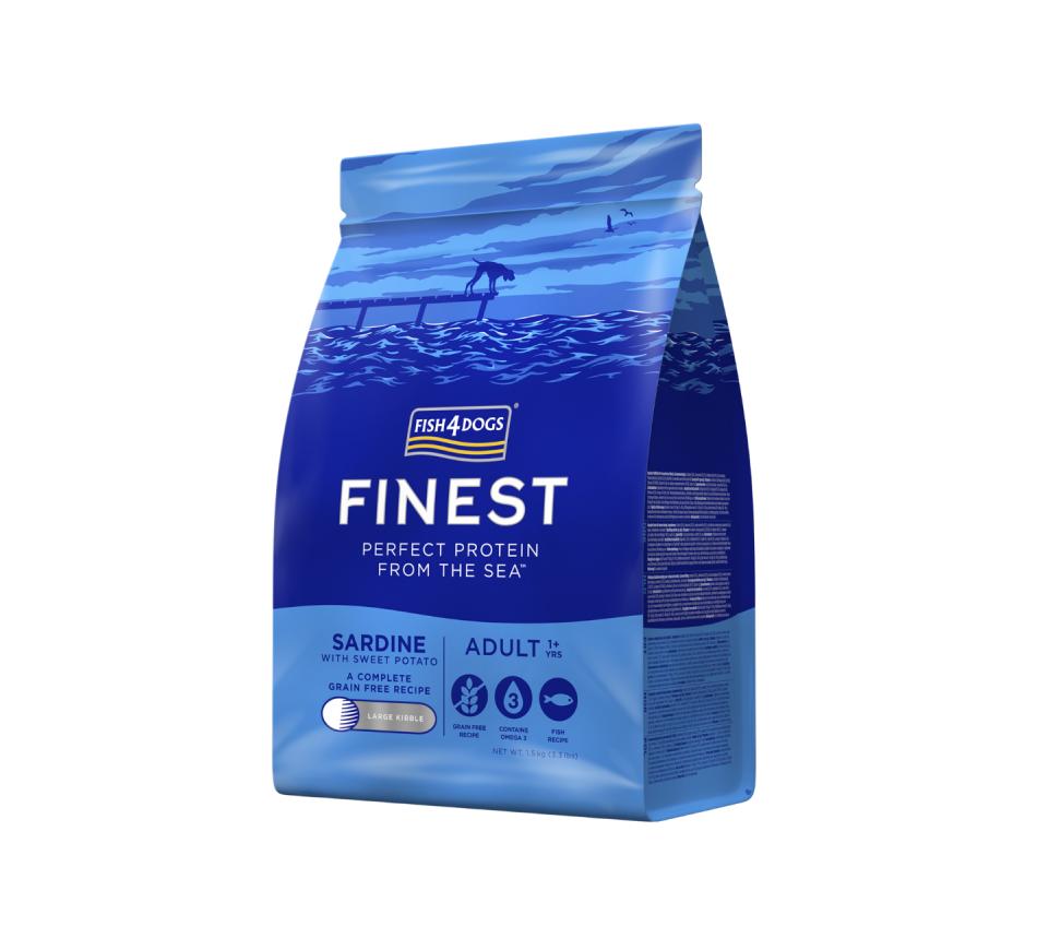 O nosso alimento completo Finest Sardine contém um elevado teor de peixe, pelo que é naturalmente rico em Ómega 3, sem ingredientes artificiais ou grãos, é adequado para todas as raças de cães adultos, óptimo para pelagens brilhantes, peles saudáveis e articulações flexíveis.