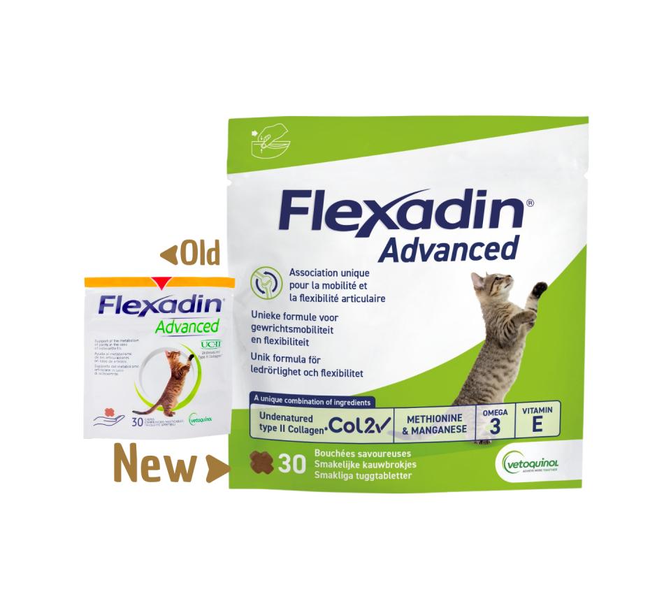 Flexadin Advanced Gatos contém UC-II, colágeno tipo II não desnaturado, que tem eficácia clinicamente comprovada para um melhor controle da osteoartrite.