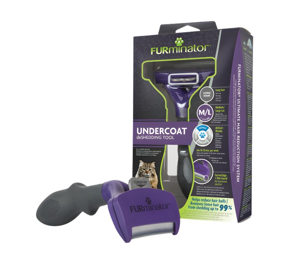 A escova Furminator Undercoat deShedding gato pelo comprido ajuda a reduzir a queda dos pelos soltos até 90% e também ajuda a diminuir a formação de bolas de pelo. Possui uma borda de aço inoxidável que retém todos os pelos e um prático botão para remover mais fácil do que nunca os pelos acumulados na borda da escova, isso permite a remoção dos pelos soltos sem danificar a pelagem externa ou cortar a pele, quando a ferramenta é usada conforme as instruções.