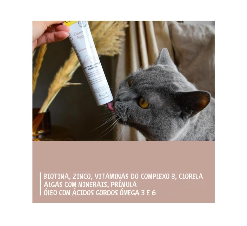 Suplemento nutricional, pasta sem açúcar para gatos. Pasta dermatológica rica em nutrientes que promove uma melhor textura da pele e uma pelagem saudável e brilhante.