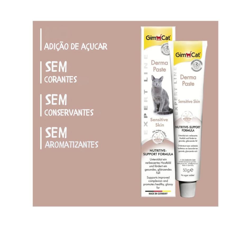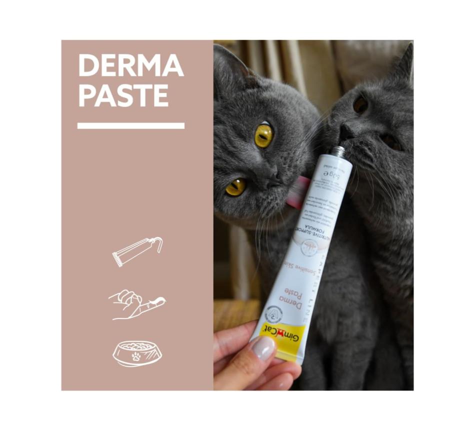 Os problemas de pele e pelo em gatos podem ocorrer por uma variedade de razões, pode-se tornar principalmente um grande desconforto para o seu gato. GimCat Derma Paste é um delicioso snack especialmente desenvolvido para promover uma pele melhor e um pelo saudável e brilhante.