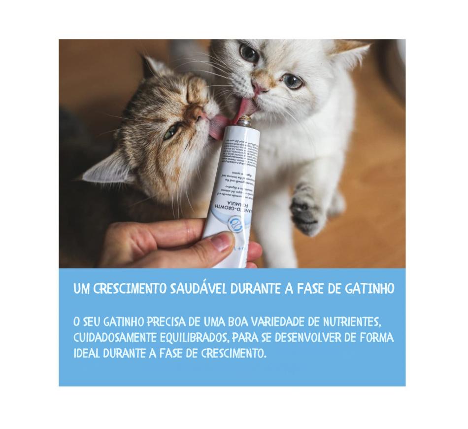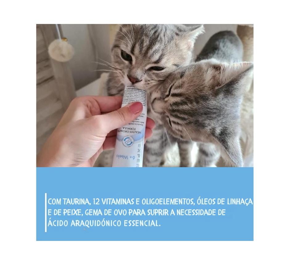 Suplemento nutricional, pasta sem açúcar para gatinhos > 6 semanas. Com proporção equilibrada de cálcio e fósforo, com vitaminas e oligoelementos, para um desenvolvimento ósseo normal, e um crescimento saudável.