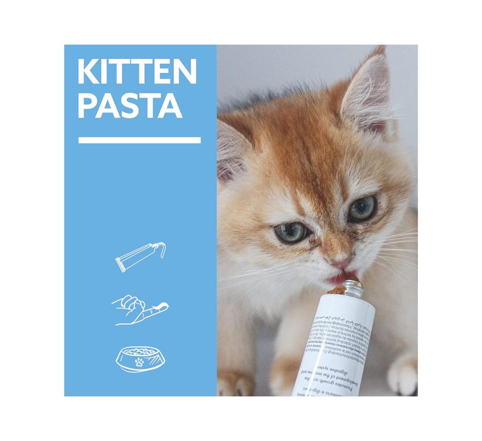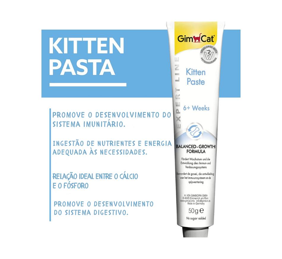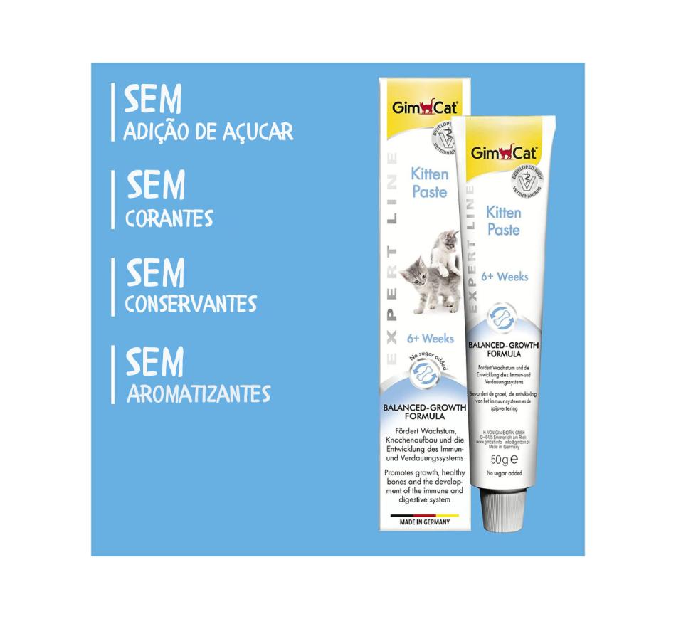 GimCat Kitten pasta é uma fórmula que para além de disponibilizar uma relação apropriada de cálcio e fósforo para o bom desenvolvimento dos ossos, incorpora também óleo de linhaça e óleo de peixe para a proteção celular e para uma pele e um pelo saudáveis. Também contém várias vitaminas, oligoelementos e minerais para um sistema imunológico forte e taurina para o correto funcionamento do coração e da vista. Esta pasta não contém adição de açúcares, conservantes nem corantes artificiais.