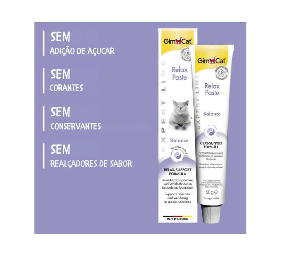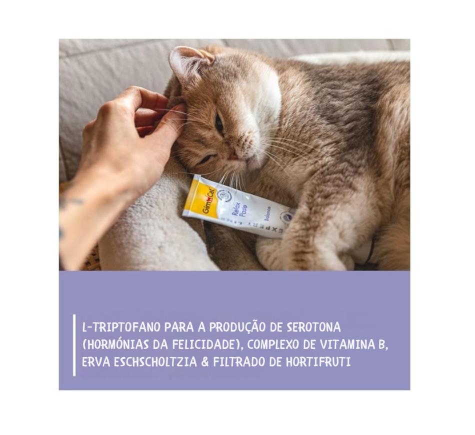 Gimcat Relax Paste - Expert Line auxilia em situações em que está muito nervoso, quase não come, não se deixa acariciar e come os pelos da cauda, isso significa que está em stress, e dando a Gimcat Pasta Relax vai ajudar o seu gato a acalmar e a baixar os níveis de stress, ansiedade.
