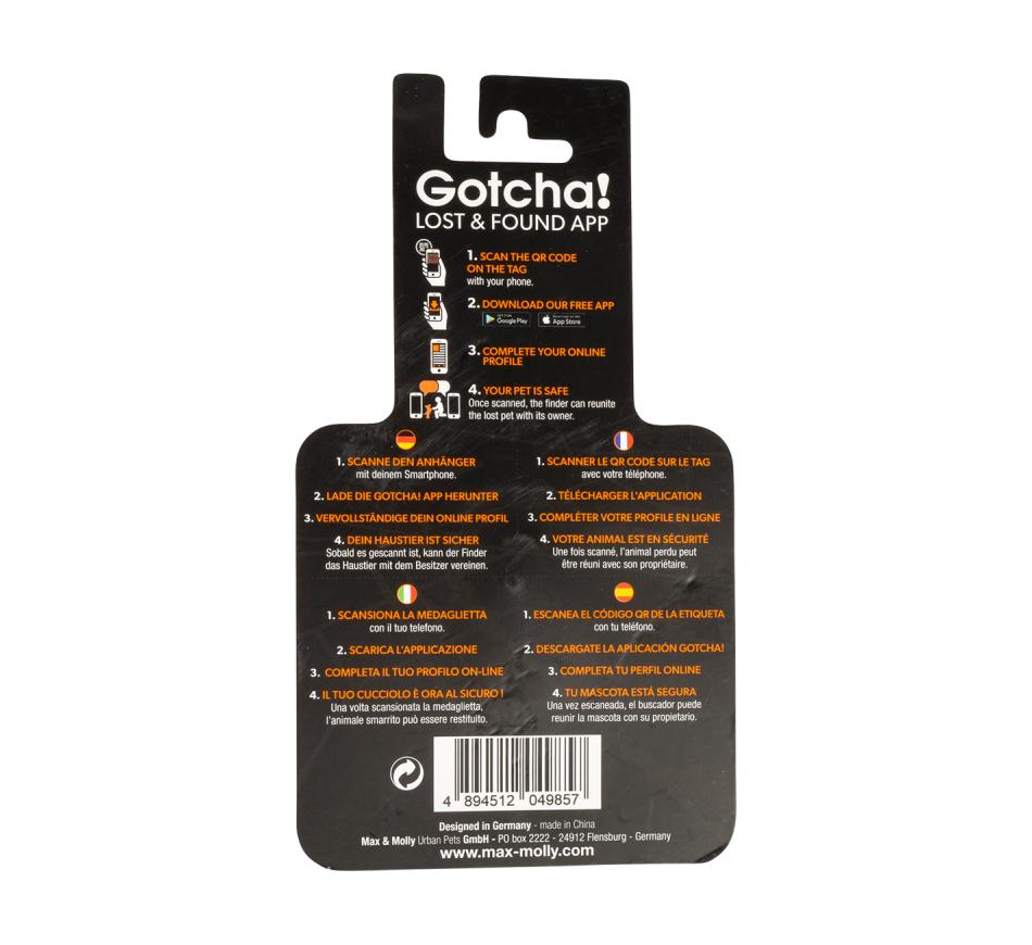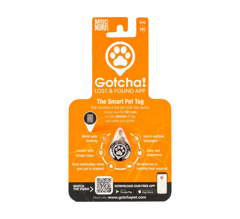Max & Molly Gotcha! Programa e aplicação, etiqueta de identificação inteligente de perdidos e achados, para animais de estimação, cães e gatos.
