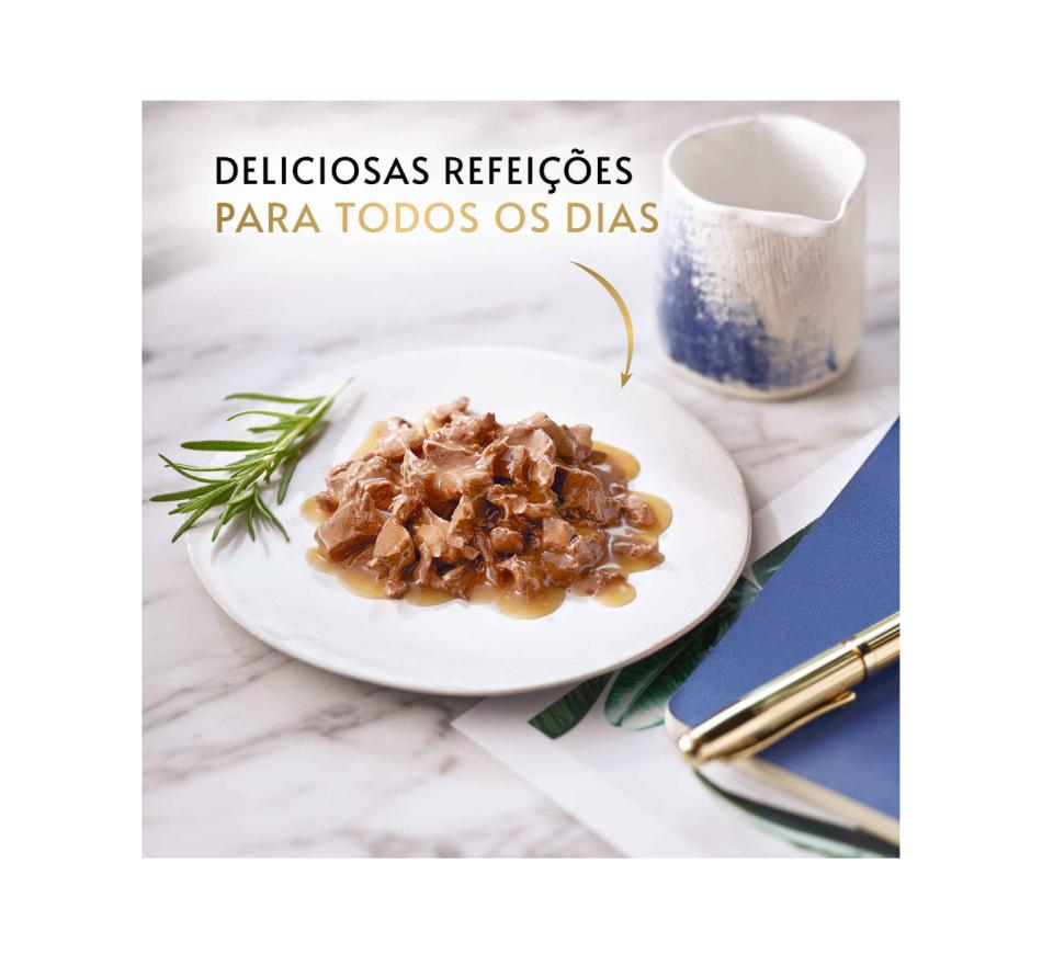GOURMET Perle Finos Pedaços são delicados pedaços com carnes ou peixes cortados em finos filetes e cuidadosamente cozinhados para criar receitas inovadoras.
