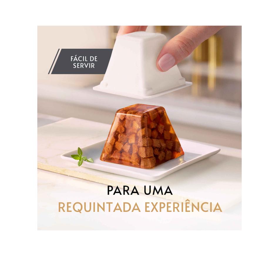 Purina Gourmet Revelations com finos pedaços em gelatina é uma sublime alimentação húmida para gatos, com uma forma perfeita para revelar um momento de refeição requintado para o seu gato. Cada receita, desta coleção de sublimes delícias, combina uma elegante gelatina transparente com finos pedaços refinados em cada dentada. Estas sublimes delícias, numa forma perfeita de pirâmide, estão repletas de deliciosos sabores, prontas para seduzir o paladar do seu gato em cada porção.