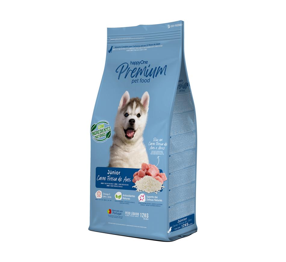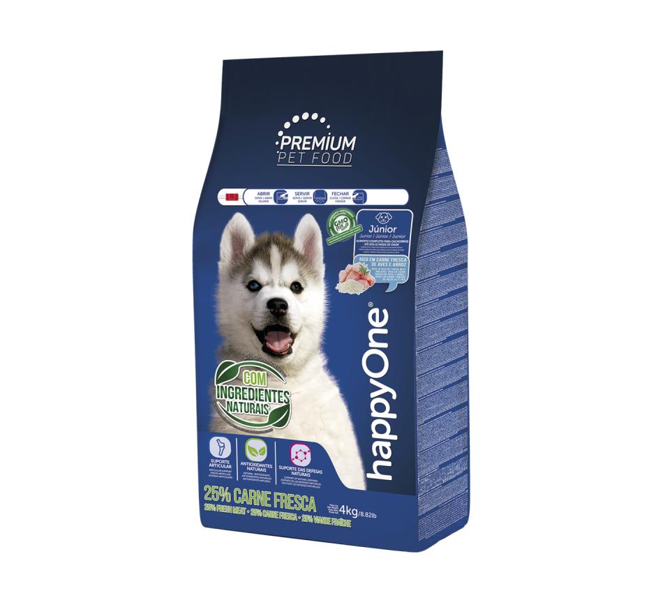 HappyOne Premium Dog Junior Carne Fresca é um alimento completo para cachorros de todas as raças até aos 12 meses de idade, rico em carne fresca de aves (25%) e arroz (16%), permitindo maior digestibilidade.