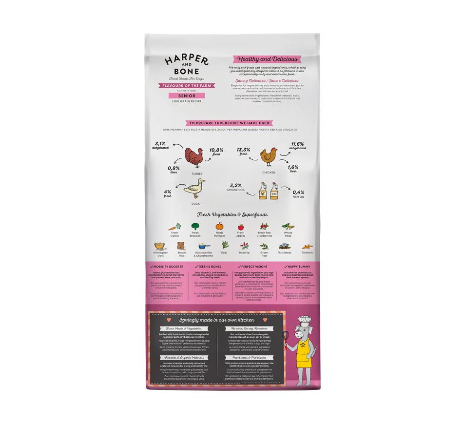 Descubra o sabor irresistível da Harper and Bone Cão Adulto All Breeds Senior & Light Flavours of the Farm!