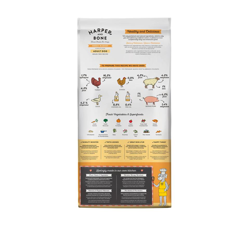 Incorporamos ainda alguns dos maravilhosos superalimentos da natureza à mistura, além de probióticos saudáveis que auxiliam na digestão. Esta receita saborosa não só é repleta de vitaminas e minerais essenciais, como também contém condroitina e glucosamina para promover a saúde dos ossos e articulações. Uma combinação vencedora que combina uma dieta perfeitamente equilibrada com os sabores mais deliciosos. Seu amigo de quatro patas certamente vai querer mais!