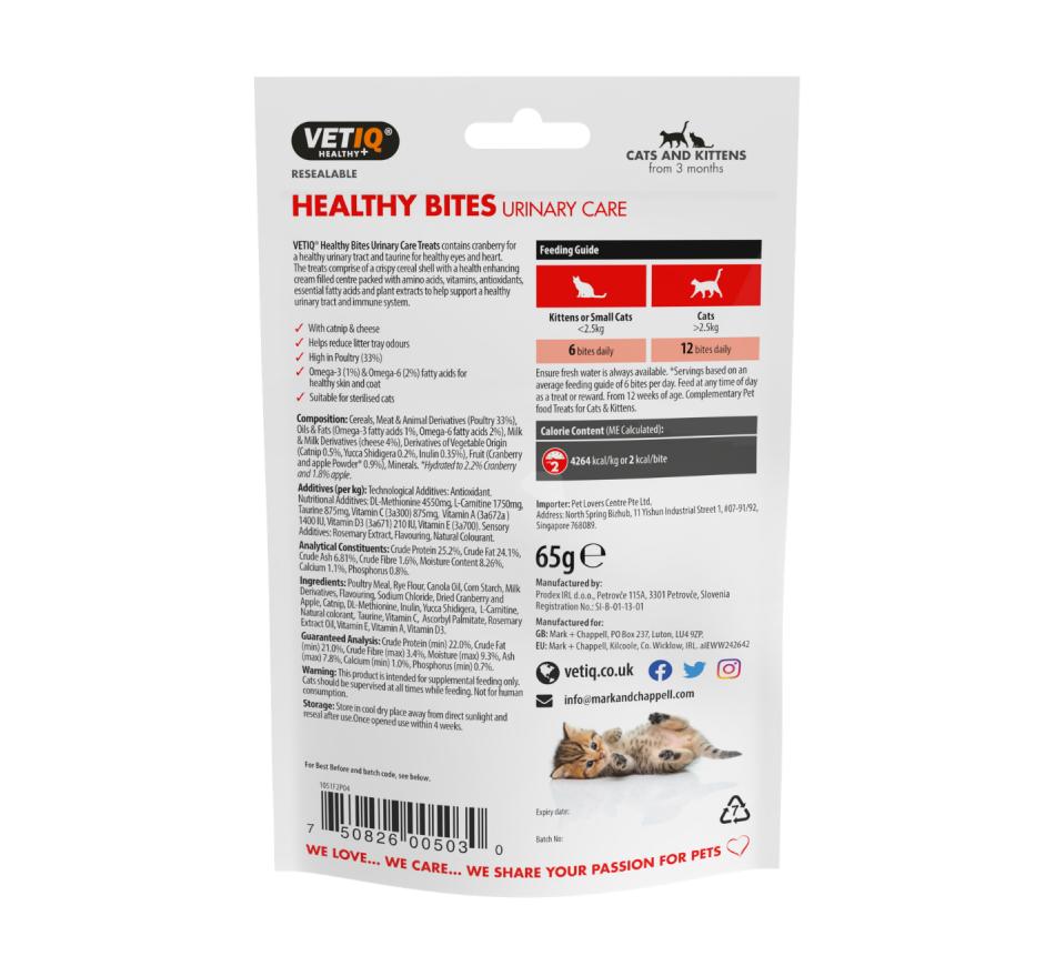 Healthy Bites Urinary Care são snacks com benefícios para a saúde geral do gato, contêm arando para um trato urinário saudável e inclui extratos vegetais que ajudam a reduzir os odores na liteira do WC. Contém taurina, para olhos e coração saudáveis, antioxidantes, para suporte do sistema imunológico, e ómega-3 e ómega-6 para a saúde da pele e do pelo. Além disso, favorecem uma boa digestão, ajudando ainda a reduzir os odores na caixa de areia do felino.