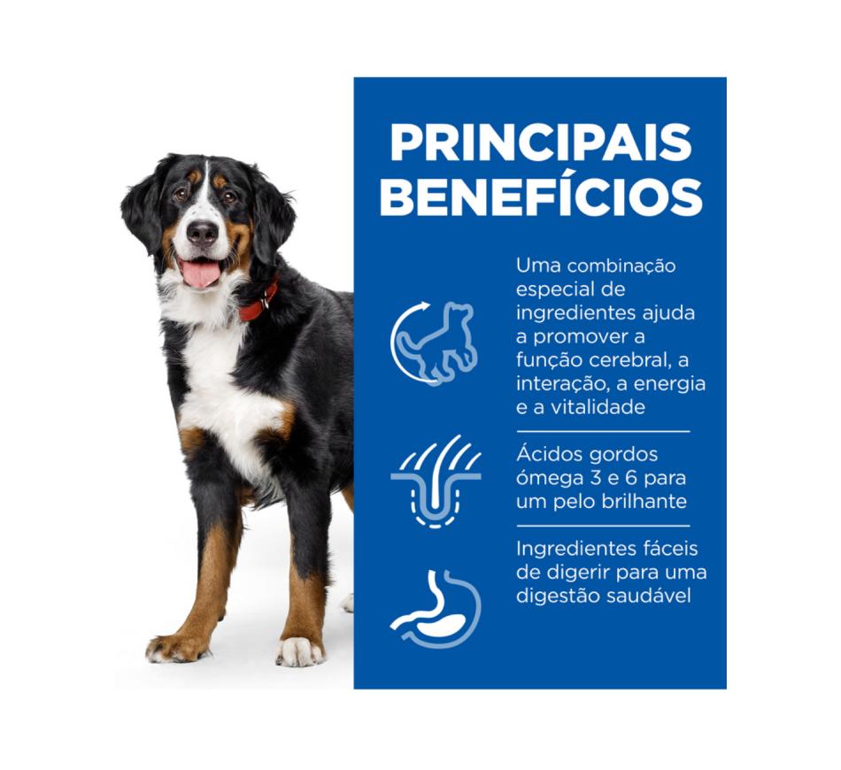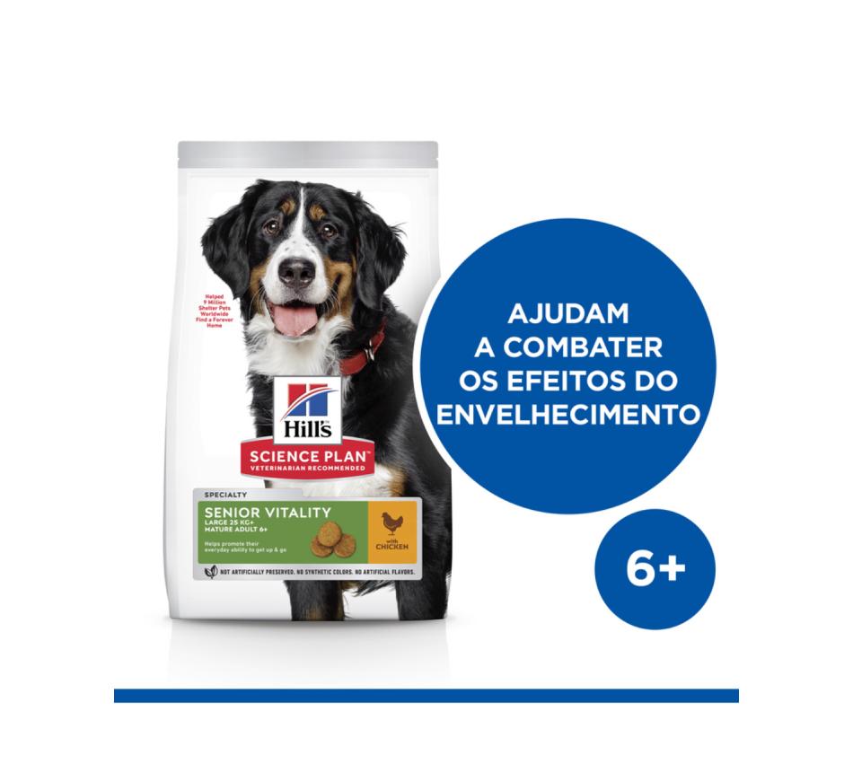 Hill's Science Plan Senior Vitality alimento para cão adulto maturo de raça grande com frango e arroz é um alimento completo para cães mais velhos de raça grande e gigante com 5 ou mais anos de idade, que ajuda a promover a sua vitalidade diariamente.