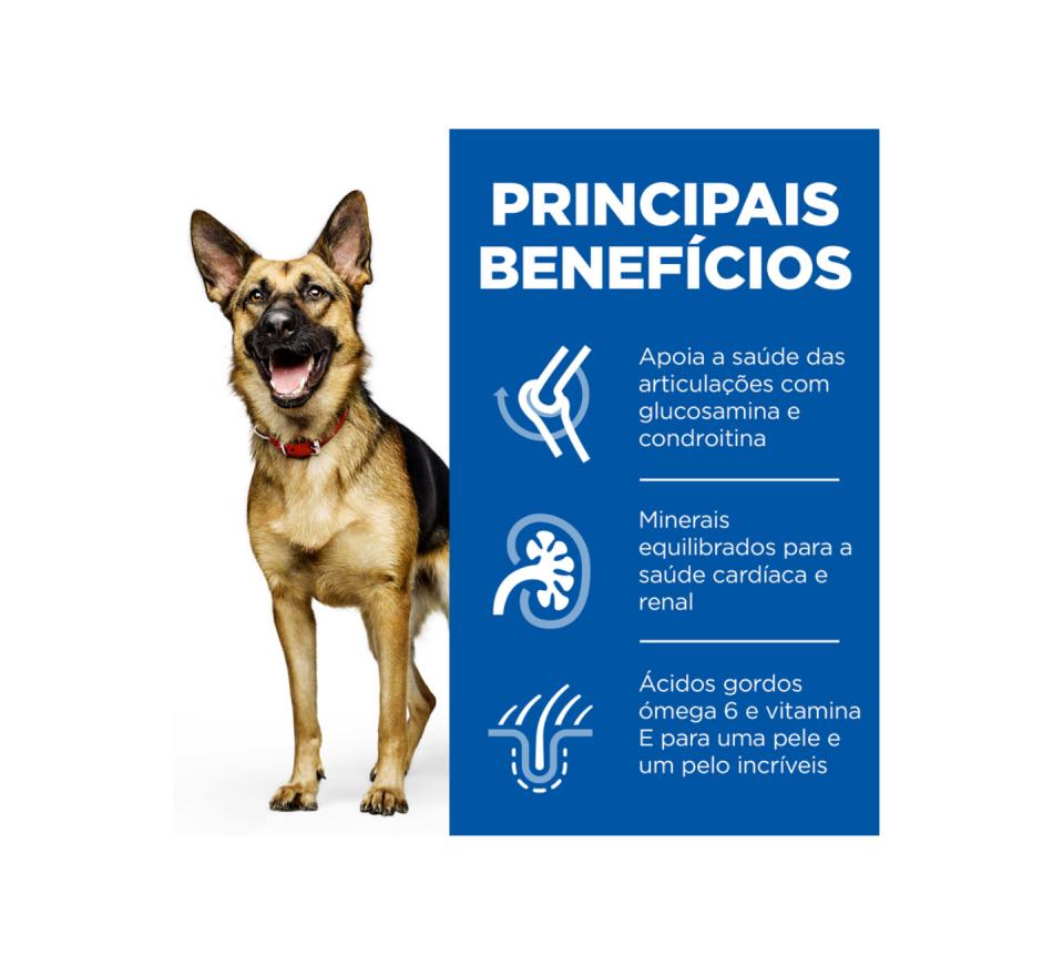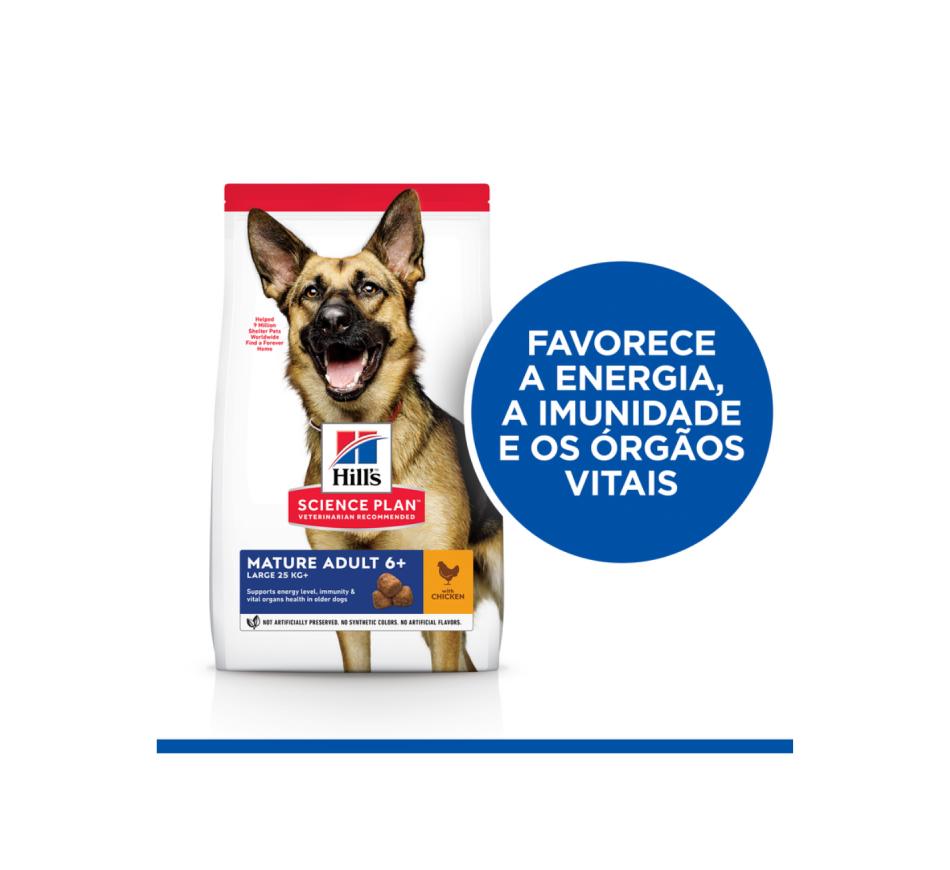 Hill's Science Plan alimento para cão adulto maturo de raça grande com frango (frango 7%; total aves 11%) é um alimento completo para cães de raça grande/gigante com 6 ou mais anos de idade.