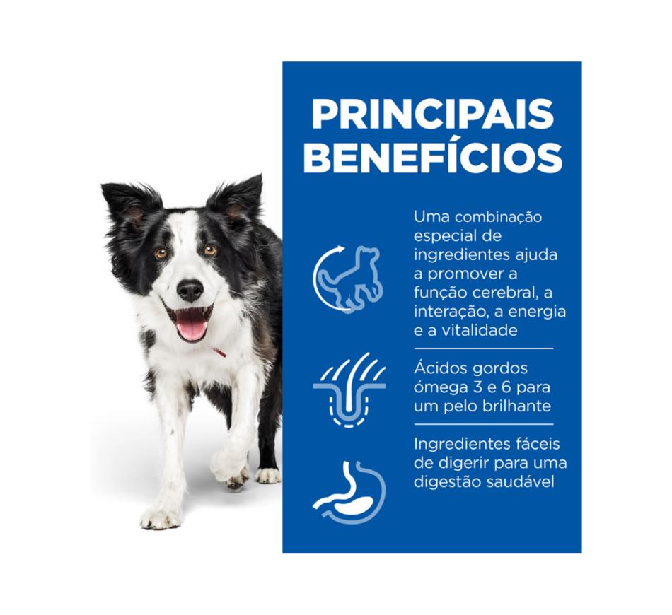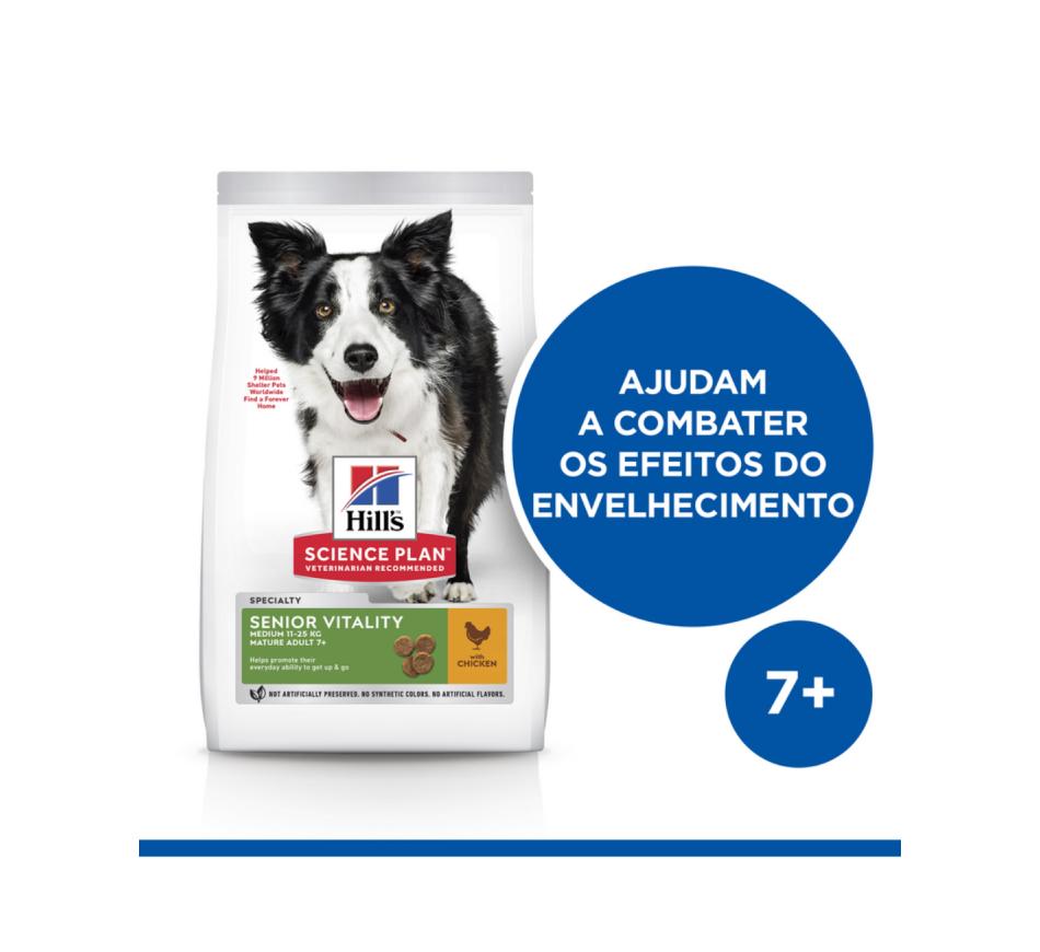 Hill's Science Plan Senior Vitality alimento para cão adulto maturo de raça média com frango e arroz é um alimento completo para cães mais velhos de raça média com 7 ou mais anos de idade, que ajuda a promover a sua vitalidade diariamente.