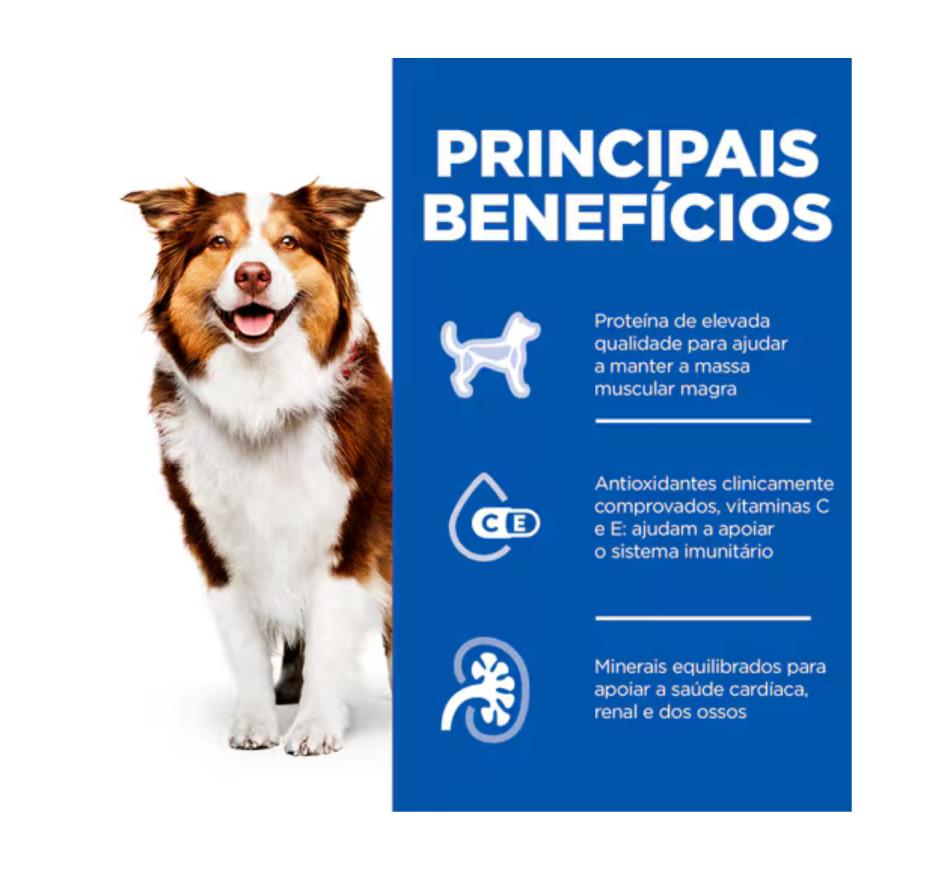 - Proteína de elevada qualidade para ajudar os cães mais velhos a manter a massa muscular magra