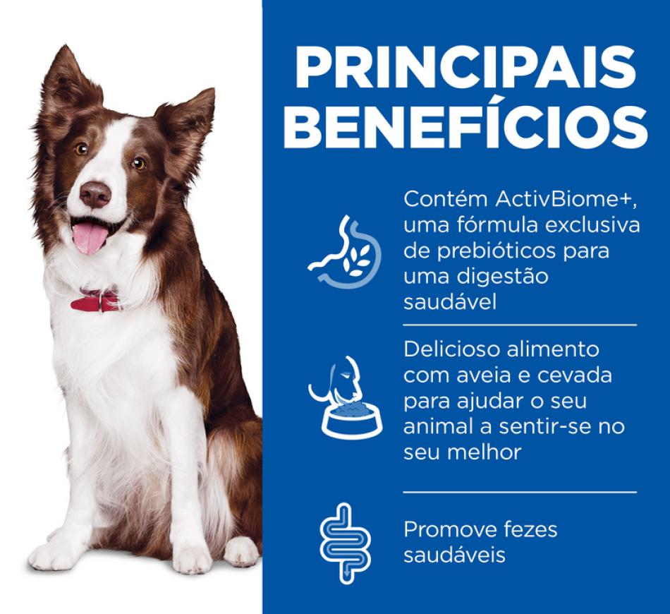 Hill's Science Plan Perfect Digestion alimento para cão adulto com frango contém ActivBiome+, uma combinação especial de prebióticos para ajudar a nutrir e a equilibrar rapidamente o microbioma único do seu animal de companhia.