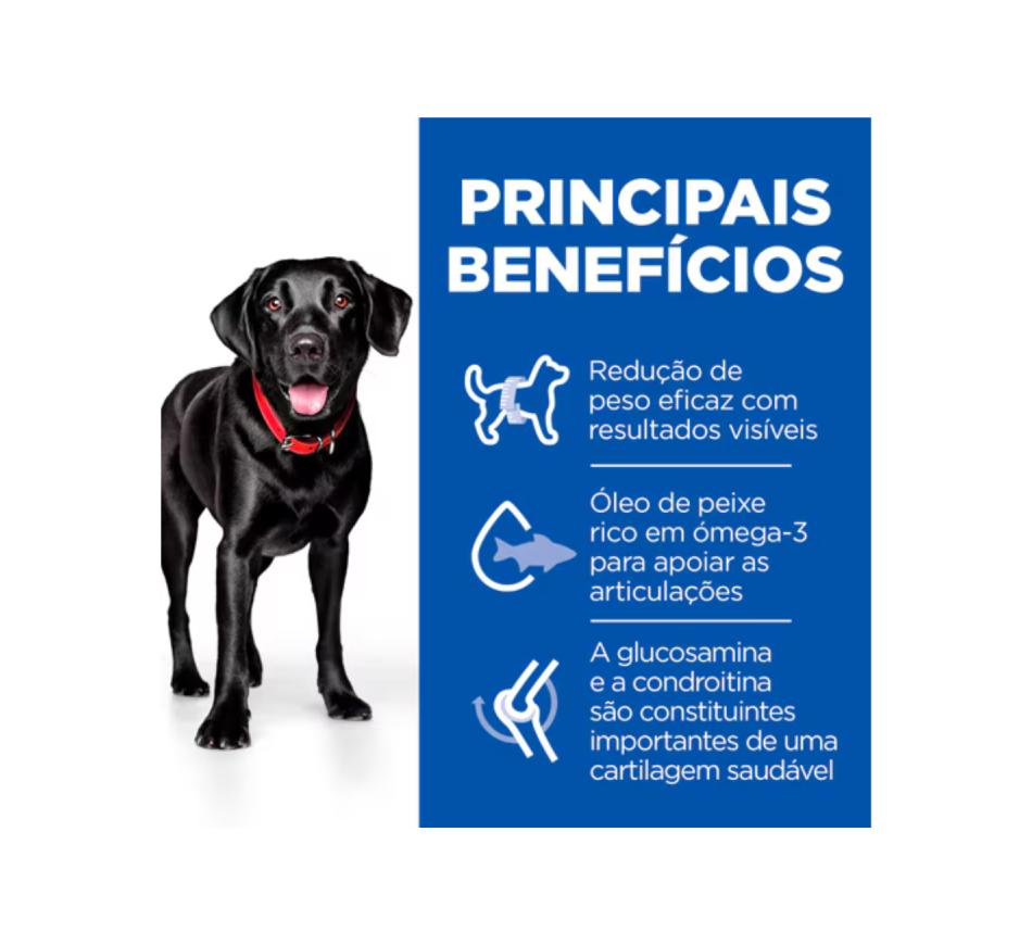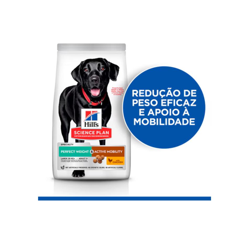 Hill's Science Plan Perfect Weight & Active Mobility alimento para cão adulto de raça grande com frango é um alimento completo para cães adultos de raça grande/gigante (+25kg) com 1 ou mais anos de idade que têm predisposição para o aumento de peso ou estão ligeiramente acima do peso, um fator de risco para problemas de mobilidade.