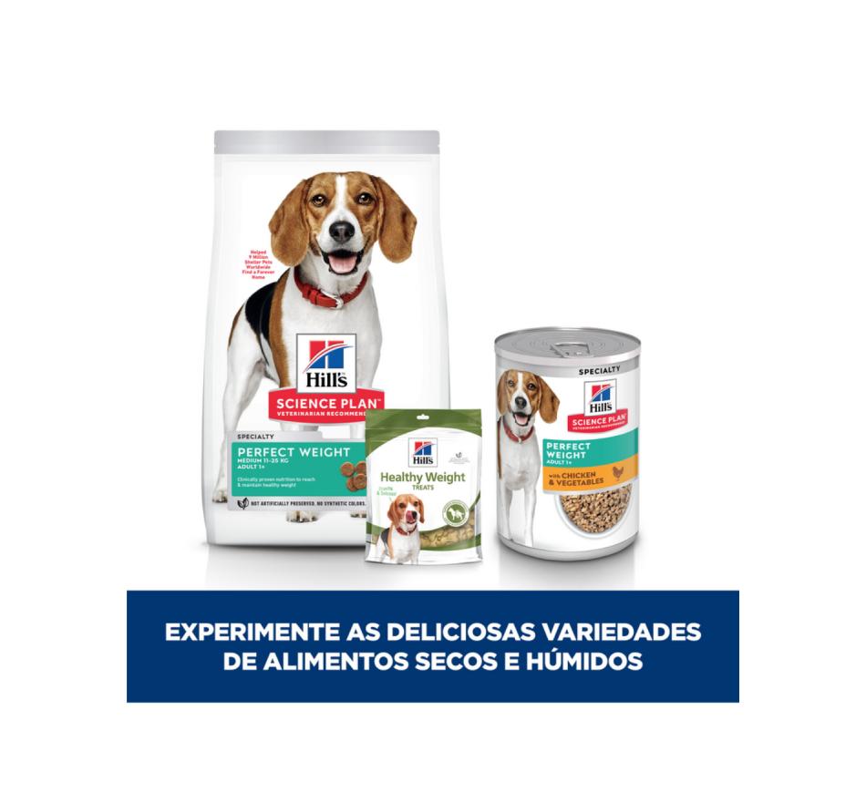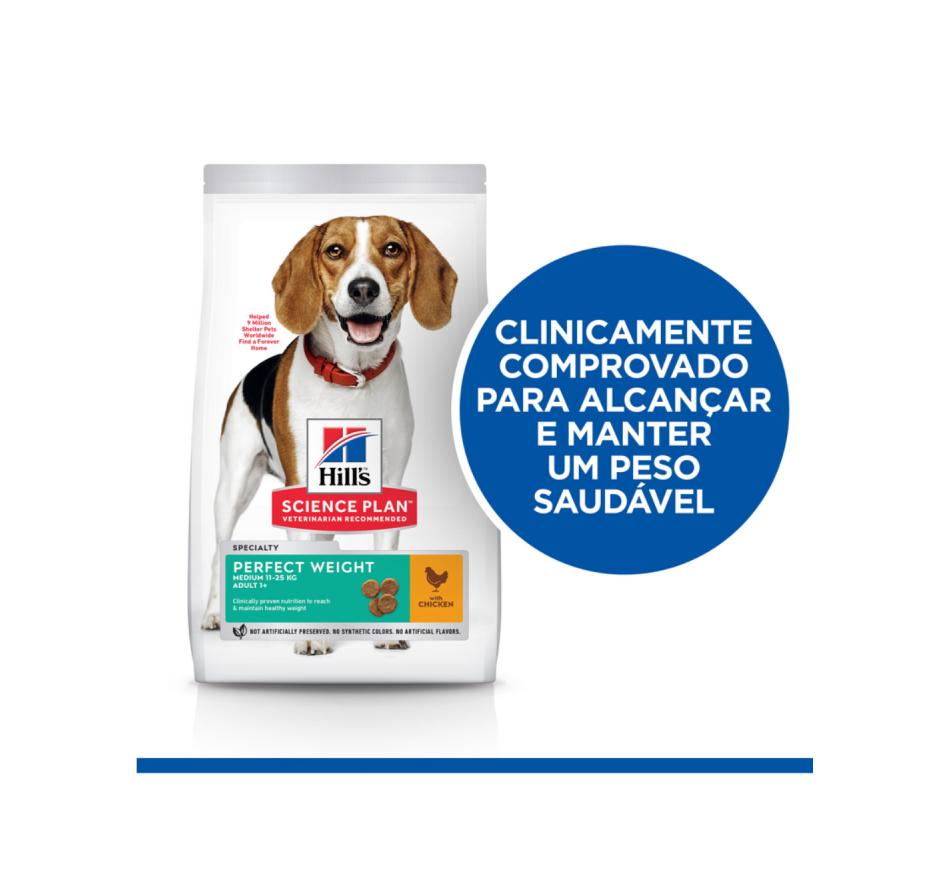 Hill's Science Plan Perfect Weight alimento para cão adulto de raça média com frango (frango 7%) é um alimento completo para cães adultos de raça média com 1 ou mais anos de idade que têm predisposição para o aumento de peso ou estão ligeiramente acima do peso.