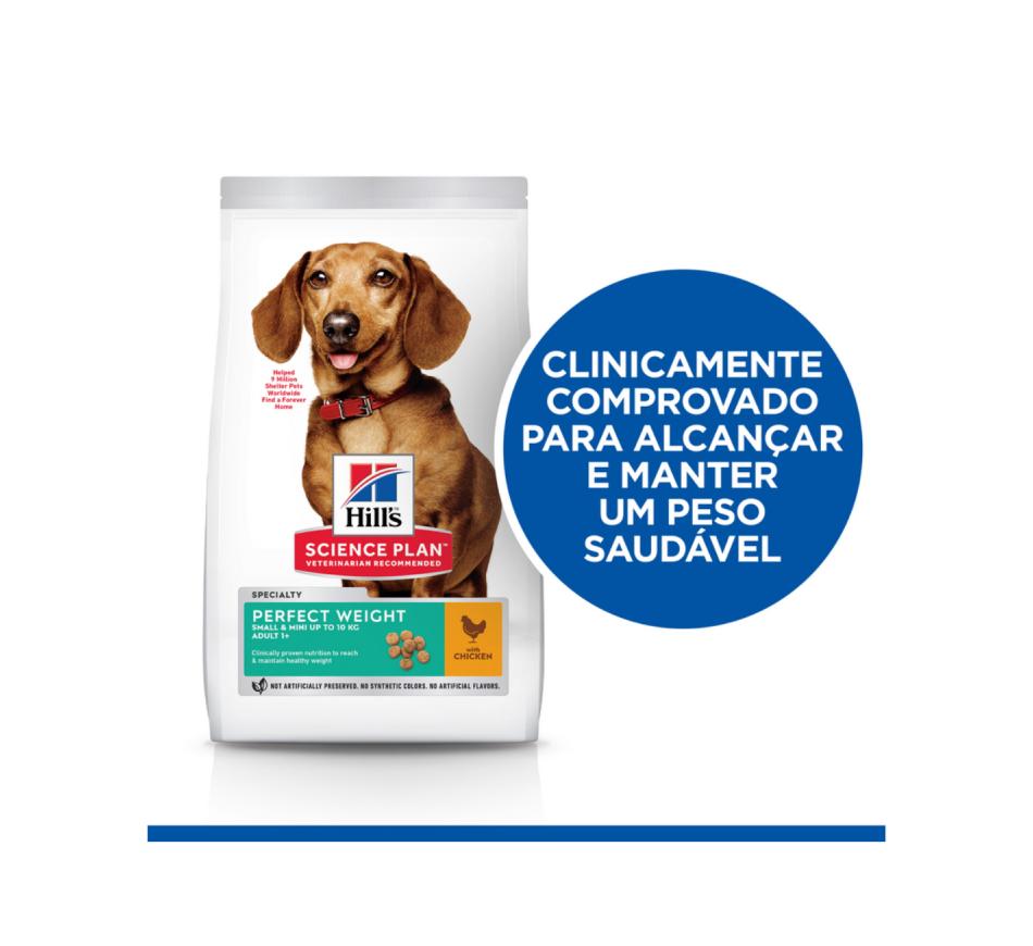 Hill's Science Plan Perfect Weight alimento para cão adulto de raça pequena e mini com frango (frango 7%) é um alimento completo para cães adultos de raça pequena com 1 ou mais anos de idade que têm predisposição para o aumento de peso ou estão ligeiramente acima do peso.