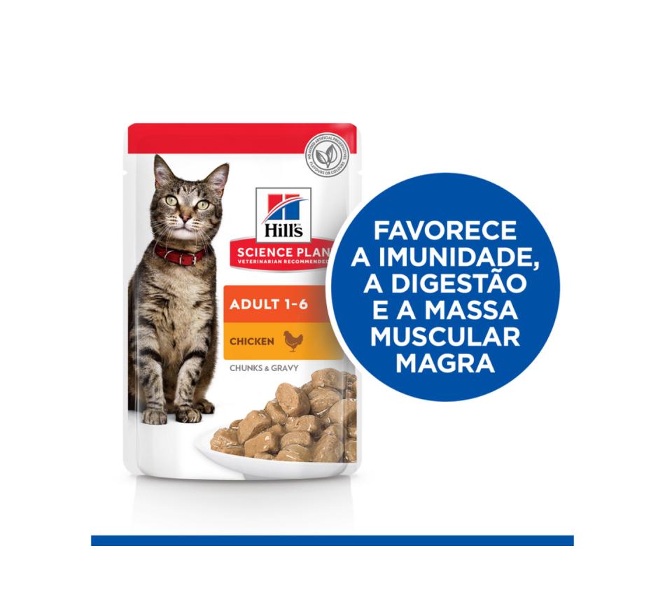 O seu gato adorará o sabor de Hill's Science Plan alimento para gato adulto com pedaços suaves de frango em molho. Contém o equilíbrio ideal entre o sabor e a nutrição e é especialmente formulado para atender às necessidades energéticas dos gatos durante o auge da sua vida. Elaborado com ingredientes de elevada qualidade e de fácil digestão.