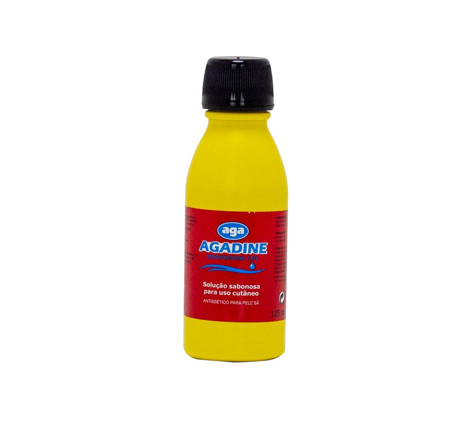 Solução Sabonosa Iodopovidona 7,5 % Agadine - Solução de Iodopovidona a 7,5% (iodo livre 0,75%) e tensioativos de espuma macia. Complexo molecular de iodo com povidona. -Antissético para pele sã de amplo espetro. -Eficaz na lavagem e desinfecção da pele, sendo actualmente preferida noutros países europeus. -Desinfeta a pele antes de qualquer tipo de intervenção.