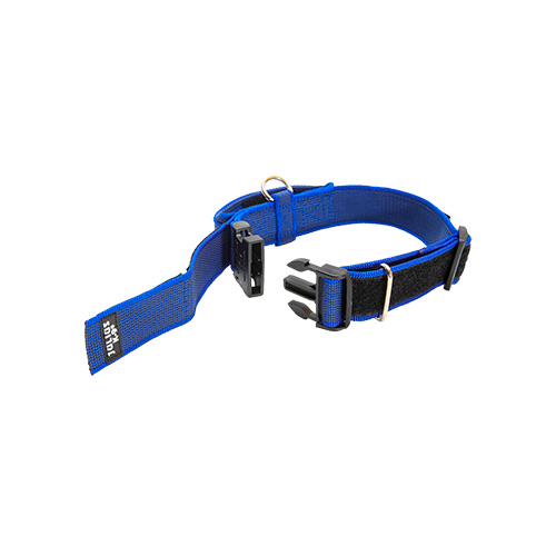 A fixação firme é assegurada por uma fivela resistente e um fecho de segurança. O material da correia do colar é fácil de limpar.