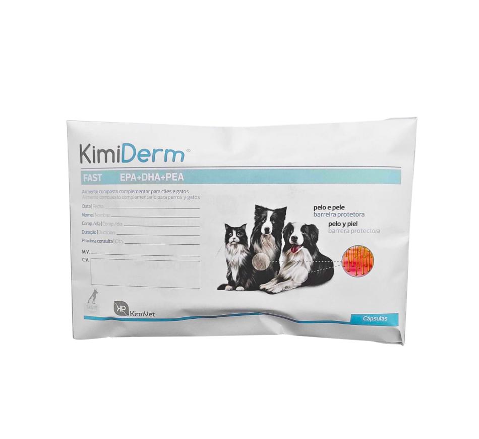Kimiderm Fast é um alimento composto complementar palatável, em cápsulas moles, otimizado com elevada concentração de ácidos Gordos Essenciais (ómega-3) rico em antioxidantes, indicado na recuperação nutricional para o controlo inflamatório em patologias degenerativas e inflamatórias, contribuindo para manter saudável a função dérmica no caso de dermatoses e alopecia.